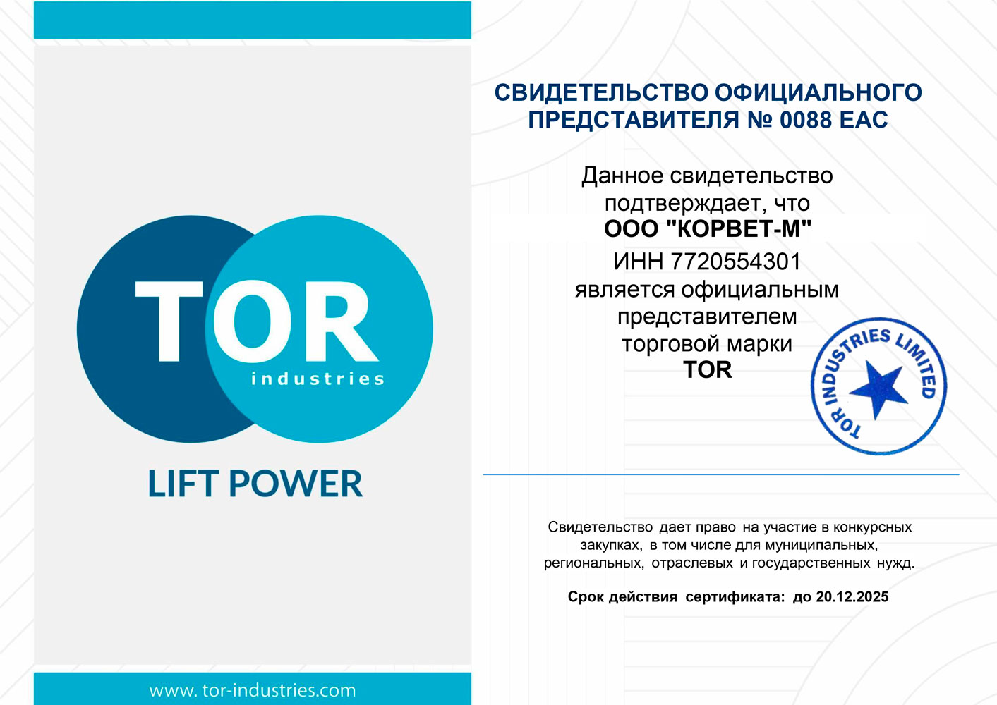 В России и странах Таможенного союза грузоподъемное оборудование TOR изготавливается в соответствии с российскими нормами безопасности и техническими условиями. Оно соответствует ТР ТС 010/2011 «О безопасности машин и оборудования», что подтверждено документами.